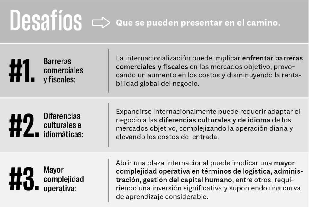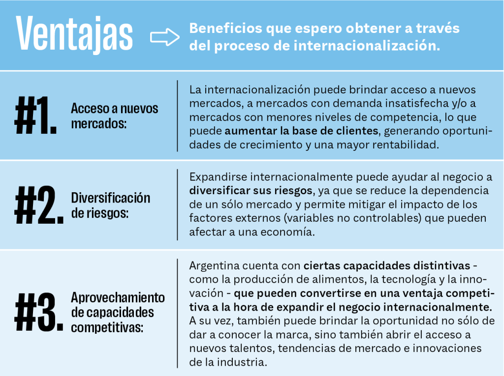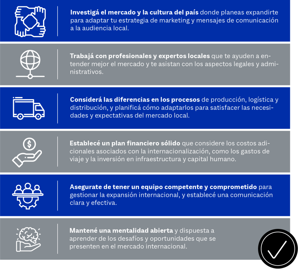 Es el proceso mediante el cual se crean las condiciones necesarias para expandir el negocio desde el mercado local a mercados extranjeros. Este camino requiere una planificación cuidadosa y una estrategia sólida para tener éxito, ya que esta decisión va a repercutir en la marca, en la operatoria interna y externa de la empresa y en su gestión.