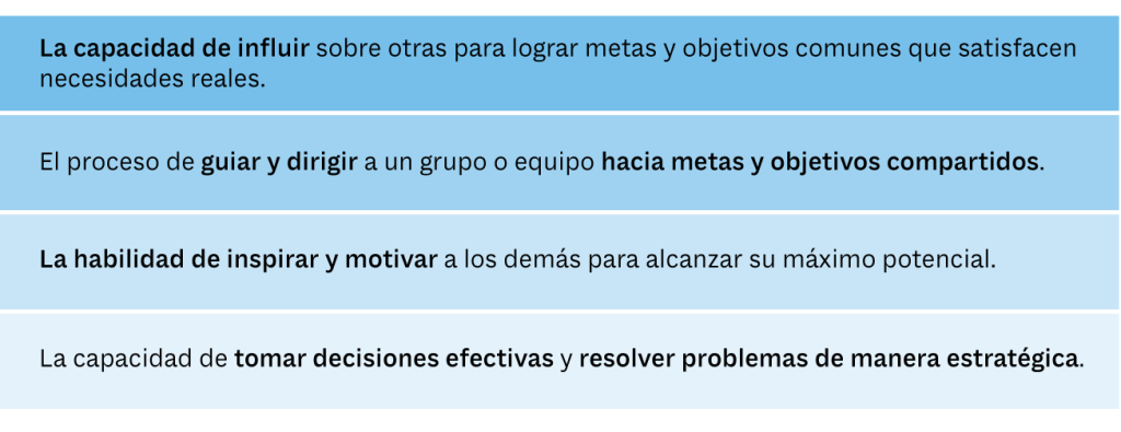 El significado del liderazgo presenta una amplia variedad de definiciones. A lo largo de la historia, se han desarrollado múltiples teorías y enfoques sobre el liderazgo. Por lo que puede ser interpretado de diversas maneras por diferentes personas y en distintos contextos.
