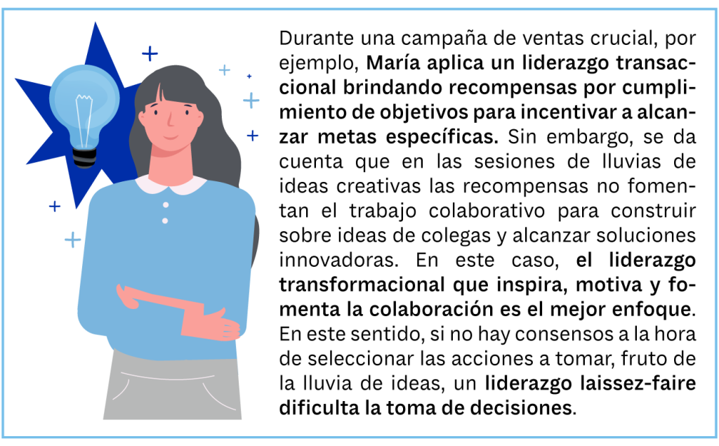 María creció con el modelo de liderazgo que ejercían en la empresa en la que trabajaba, desde una autoridad distante. Sin embargo, a lo largo del tiempo cada vez le resultó más difícil atraer y retener a personas jóvenes. No lograba comprender a qué se debía, hasta que una persona del equipo, en una encuesta de salida, menciona la rigidez del clima de trabajo. Es así que, con capacitaciones, María comprendió la necesidad de adaptar su enfoque a diferentes situaciones y personas. Aceptando que no hay un único estilo de liderazgo exitoso.